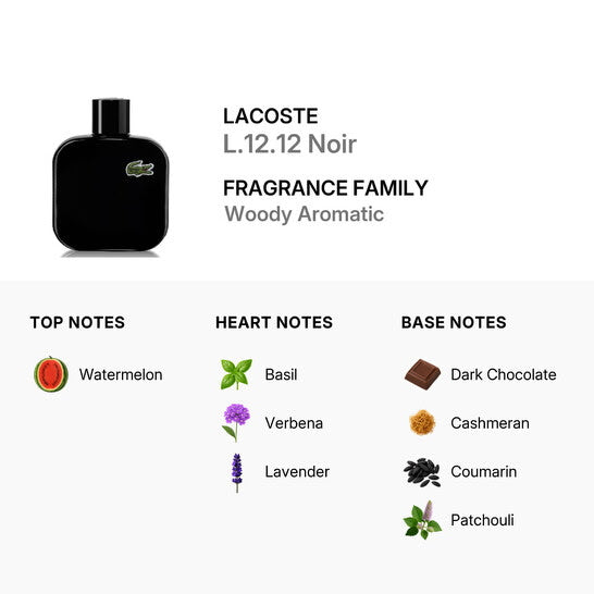 Eau de Lacoste L.12.12. Noir by Lacoste is a Woody Aromatic fragrance for men.Eau de Lacoste L.12.12. Noir was launched in 2013. Top note is watermelon; middle notes are basil, verbena and lavender; base notes are dark chocolate, cashmeran, coumarin and patchouli. All products are 100% original and authentic name brands. We do not sell knockoffs or imitations.